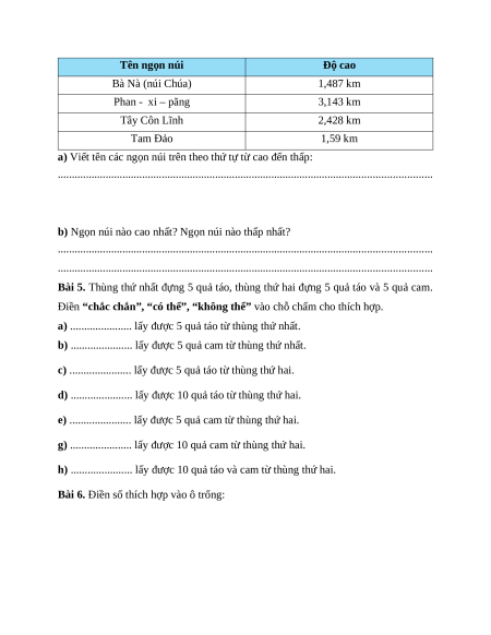 Bài 4. Bảng dưới đây cho biết độ cao của một số ngọn núi ở Việt Nam. Tên ngọn núi Độ cao Bà Nà (núi Chúa) 1,487 km Phan - xi – păng 3,143 km Tây Côn Lĩnh 2,428 km Tam Đảo 1,59 km