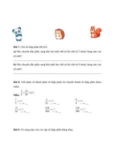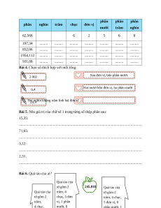 Bài 3. Viết mỗi chữ số của một số thập phân vào một ô trống ở “hàng” thích hợp Số thập Hàng Hàng Hàng Hàng Hàng Hàng Hàng phần phần phần phân nghìn trăm chục đơn vị mười trăm nghìn 62,568 6 2 5 6 8 197,34 ......... ......... ......... ......... ......... ......... ......... 852,06 ......... ......... ......... ......... ......... ......... ......... 1954,112 ......... ......... ......... ......... ......... ......... ......... 931,08 ......... ......... ......... ......... ......... ......... .........
