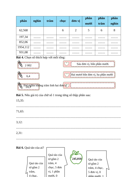 Bài 6. Quả táo của ai? Quả táo của tớ gồm 2 245,018 Quả táo của Quả táo của trăm, 4 tớ gồm 2 tớ gồm 2 chục, 5 đơn trăm, 4 chục, trăm, vị, 1 phần 5 đơn vị, 0 4 chục, mười, 0 phần mười, 1 Quả táo của tớ gồm 2 Quả táo của Quả táo của trăm, 4 tớ gồm 2 tớ gồm 2 chục, 5 đơn trăm, 4 chục, trăm, vị, 1 phần 5 đơn vị, 0 4 chục, mười, 0 phần mười, 1