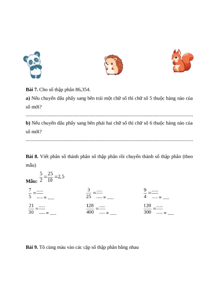 Bài 8. Viết phân số thành phân số thập phân rồi chuyển thành số thập phân (theo mẫu) Mẫu: = ..... = ..... = ..... = ..... = ..... = .....