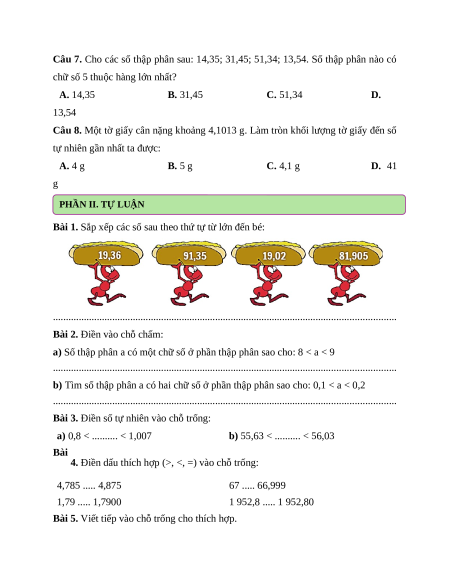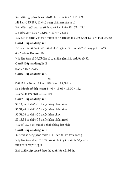 Câu 7. Cho các số thập phân sau: 14,35; 31,45; 51,34; 13,54. Số thập phân nào có