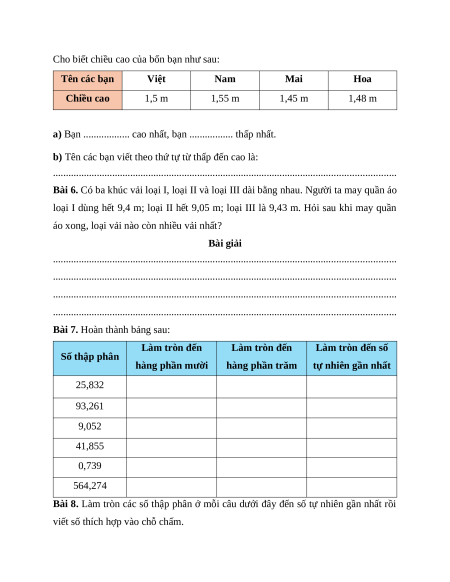 Cho biết chiều cao của bốn bạn như sau: Tên các bạn Việt Nam Mai Hoa Chiều cao 1,5 m 1,55 m 1,45 m 1,48 m