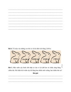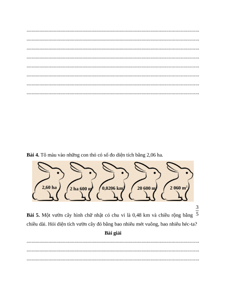 Bài 4. Tô màu vào những con thỏ có số đo diện tích bằng 2,06 ha. 2,60 ha 2 ha 600 m2 0,0206 km2 2 060 m2 20 600 m2
