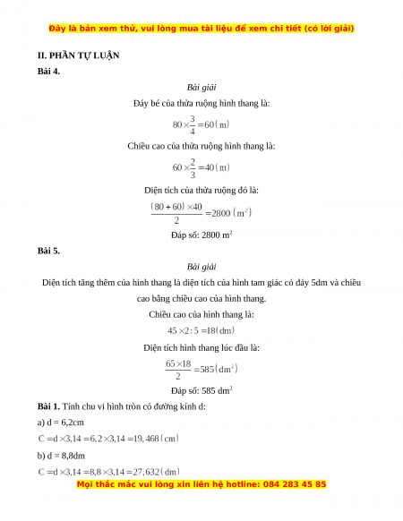 Câu 1. Diện tích hình thang có đáy lớn 8,6cm, đáy bé 7,2cm và chiều cao 4,8cm là: A. 37,92cm2 B. 37,92cm C. 75,84cm2 D. 75,84cm II. PHẦN TỰ LUẬN