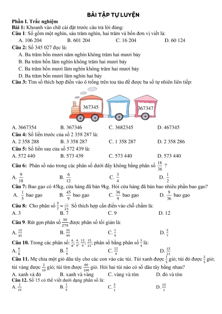 Câu 3: Tìm số thích hợp điền vào ô trống trên toa tàu để được ba số tự nhiên liên tiếp: 367345 367347 A. 3667354 B. 367346 C. 3682345 D. 467345