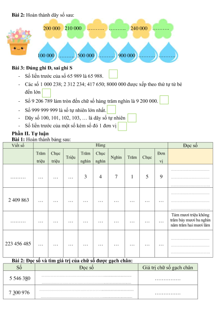 Câu 4: Số liền trước của số 2 358 287 là: A. 2 358 288 B. 3 358 287 C. 1 358 287 D. 2 358 286