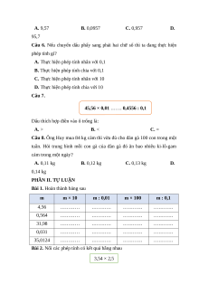 Câu 2. Số trừ là 24,56. Hiệu là 9,5. Vậy số bị trừ là: A. 34,06 B. 15,06 C. 233,32 D. 8,52 Câu 3.