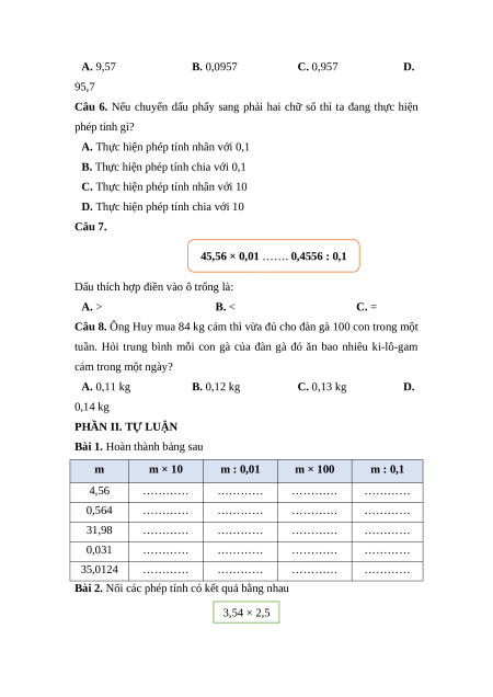Câu 5. Kết quả của phép tính 0,957 : 0,01 là: A. 9,57 B. 0,0957 C. 0,957 D. 95,7