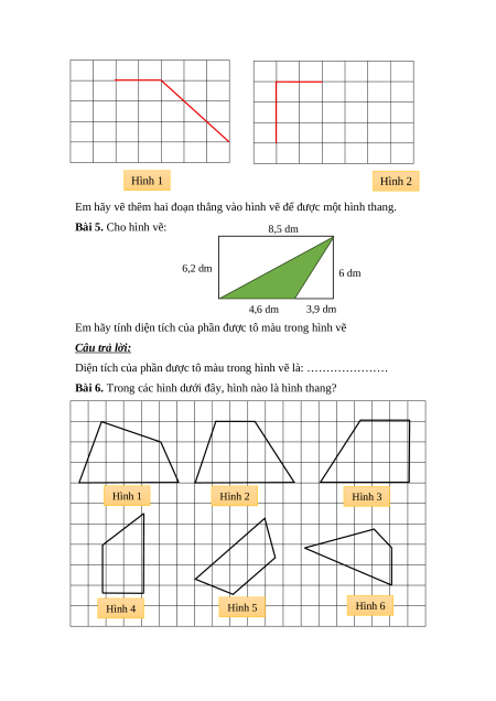 Em hãy vẽ thêm hai đoạn thẳng vào hình vẽ để được một hình thang. Bài 5. Cho hình vẽ: 8,5 dm 6,2 dm 6 dm 4,6 dm 3,9 dm