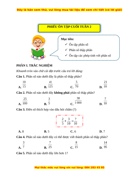 PHIẾU ÔN TẬP CUỐI TUẦN 2 Mục tiêu: Ôn tập phân số Phân số thập phân