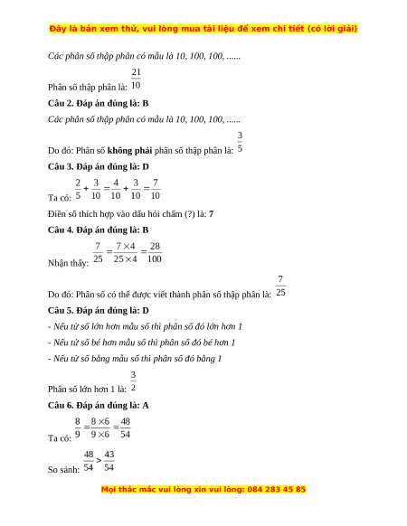 Câu 1. Phân số nào dưới đây là phân số thập phân? A. B. C. D.