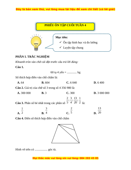 PHIẾU ÔN TẬP CUỐI TUẦN 4 Mục tiêu: