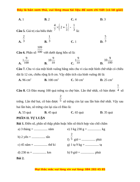 hai lần bán, số trứng còn lại của cô Đào là: A. 55 quả B. 45 quả C. 65 quả D. 35 quả PHẦN II. TỰ LUẬN