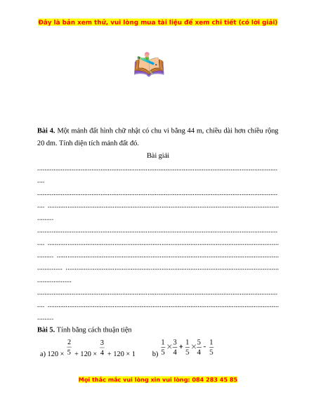 Bài 4. Một mảnh đất hình chữ nhật có chu vi bằng 44 m, chiều dài hơn chiều rộng