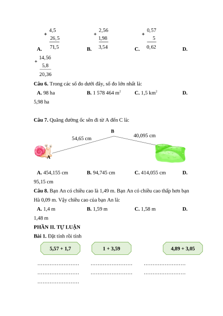 Câu 7. Quãng đường ốc sên đi từ A đến C là: B 40,095 cm 54,65 cm C A A. 454,155 cm B. 94,745 cm C. 414,055 cm D. 95,15 cm