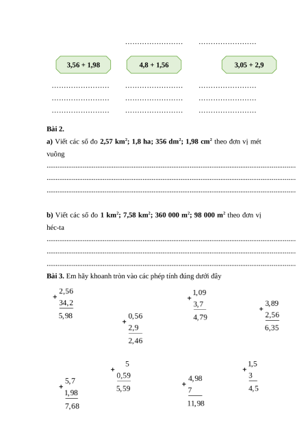 Bài 1. Đặt tính rồi tính 5,57 + 1,7 1 + 3,59 4,89 + 3,05 …………………… …………………… …………………… …………………… …………………… …………………… …………………… …………………… …………………… 3,56 + 1,98 4,8 + 1,56 3,05 + 2,9 …………………… …………………… …………………… …………………… …………………… …………………… …………………… …………………… …………………… Bài 2.