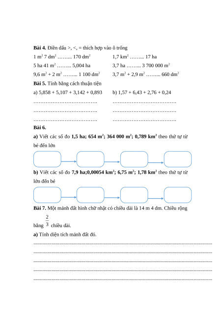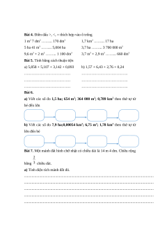 Bài 4. Điền dấu >, <, = thích hợp vào ô trống 1 m2 7 dm2 ……... 170 dm2 1,7 km2 ……... 17 ha 5 ha 41 m2 ……... 5,004 ha 3,7 ha ……... 3 700 000 m2