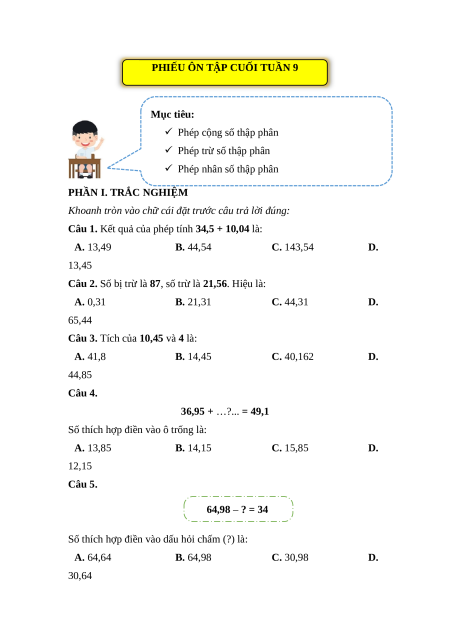 Câu 1. Kết quả của phép tính 34,5 + 10,04 là: A. 13,49 B. 44,54 C. 143,54 D. 13,45