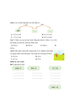 Câu 6. Các số thích hợp điền vào chỗ chấm là: - 3,95 + 2,56 4,67 …… …… A. 7,23 và 3,28 B. 6,13 và 2,18 C. 7,13 và 3,18 D. 6,23 và 2,28