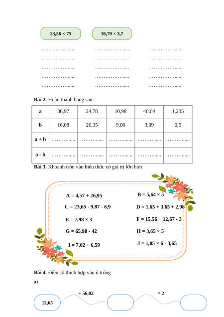 Bài 3. Khoanh tròn vào biểu thức có giá trị lớn hơn A = 4,57 + 26,95 B = 5,64 × 5 C = 23,65 - 9,87 - 6,9 D = 1,65 + 3,65 + 2,98 E = 7,98 × 3 F = 15,56 + 12,67 - 3 G = 65,98 - 42 H = 3,65 × 5 I = 7,02 + 6,59 J = 1,05 × 6 - 3,65