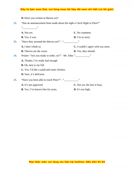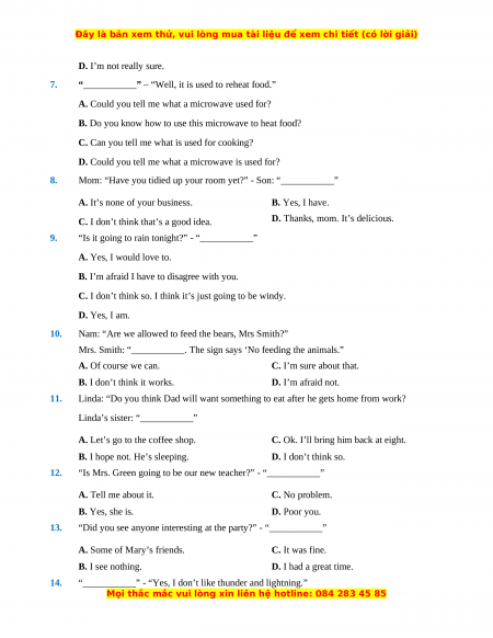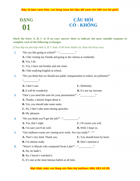 (Chọn đáp án phù hợp nhất A, B, C hoặc D để hoàn thành các đoạn hội thoại sau) 1.