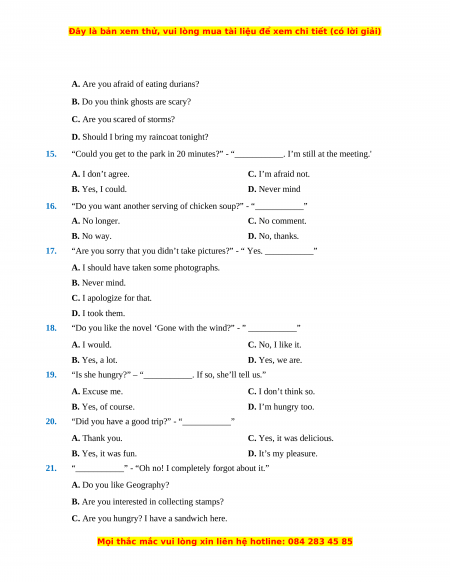 “Could you get to the park in 20 minutes?” - “___________. I’m still at the meeting.' A. I don’t agree. C. I’m afraid not. B. Yes, I could. D. Never mind 16.