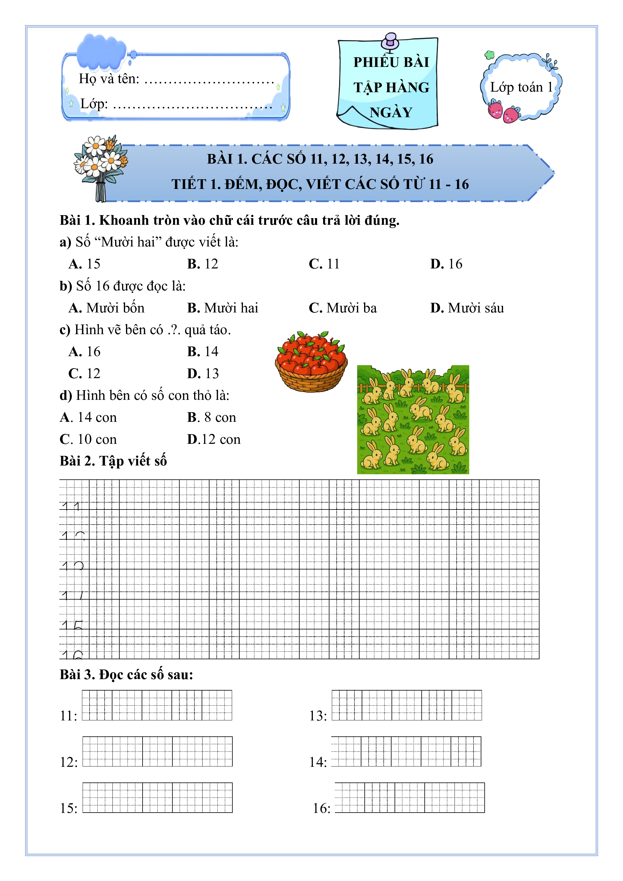 BÀI 1. CÁC SỐ 11, 12, 13, 14, 15, 16