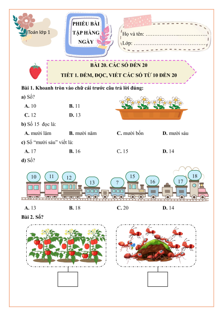 Bài 1. Khoanh tròn vào chữ cái trước câu trả lời đúng: a) Số? A. 10 B. 11 C. 12 D. 13 b) Số 15 đọc là: A. mười lăm B. mười năm C. mười bốn D. mười sáu