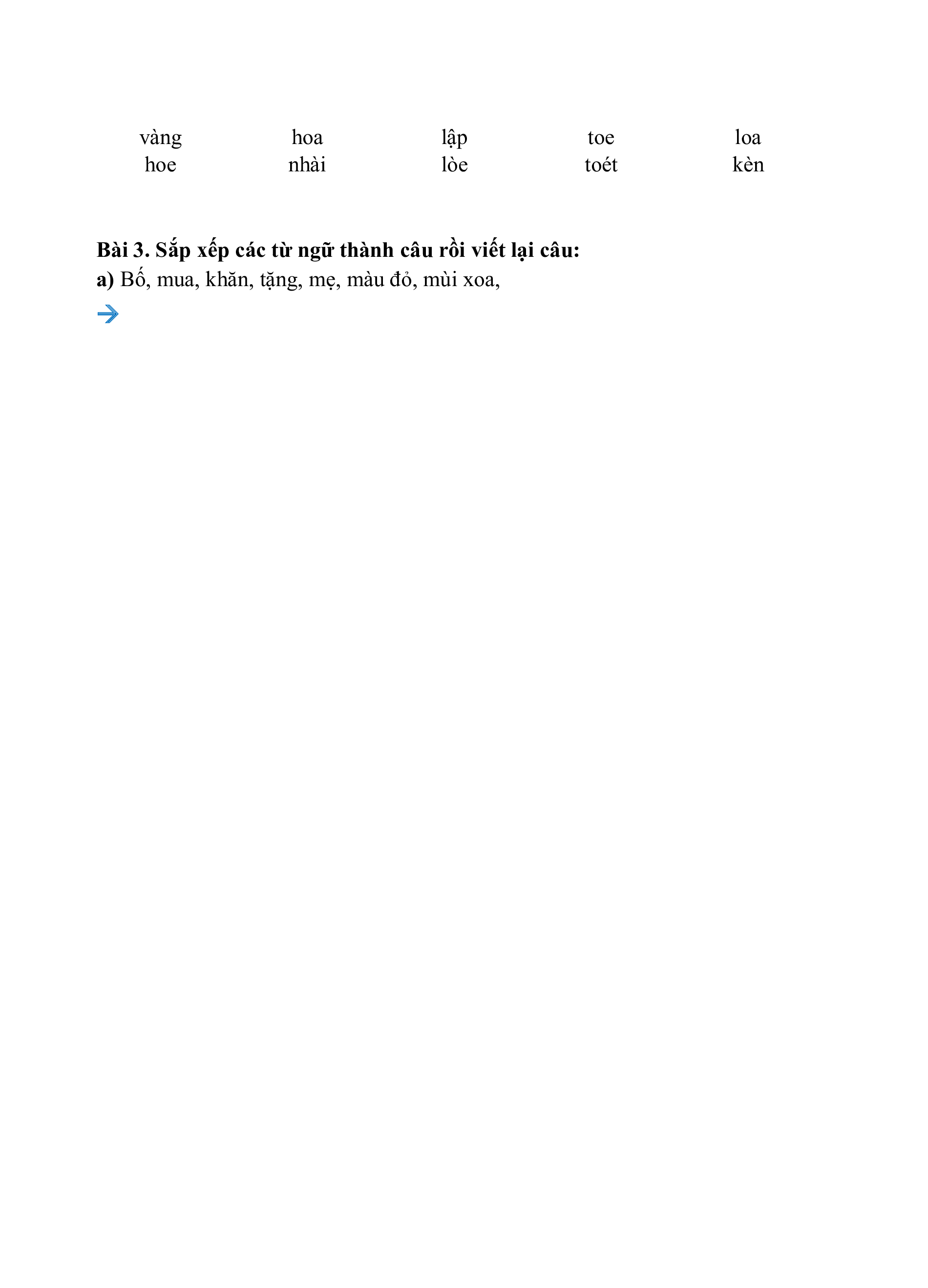 Bài 2. Tô màu xanh lá vào tiếng chứa vần “oa”, màu xanh dương vào tiếng chứa vần “oe”: vàng hoa lập toe loa hoe nhài lòe toét kèn