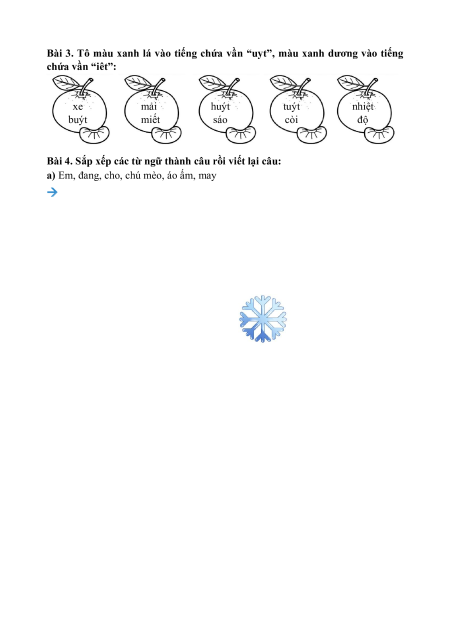 Bài 3. Tô màu xanh lá vào tiếng chứa vần “uyt”, màu xanh dương vào tiếng