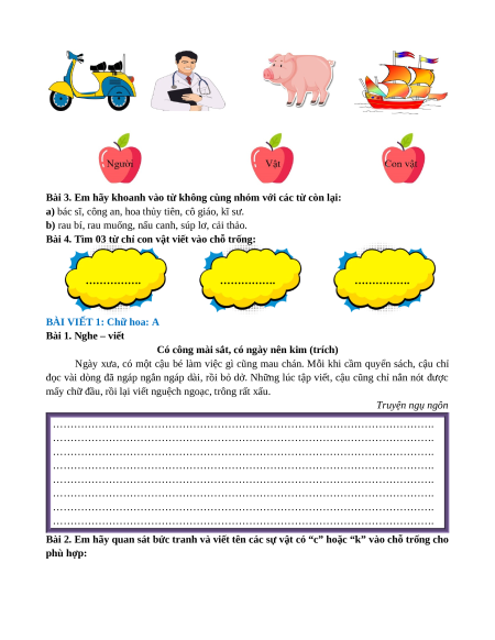 Bài 4. Tìm 03 từ chỉ con vật viết vào chỗ trống: ……………. ……………. ……………. BÀI VIẾT 1: Chữ hoa: A Bài 1. Nghe – viết