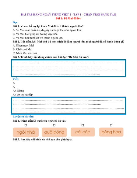 BÀI TẬP HẰNG NGÀY TIẾNG VIỆT 2 - TẬP 1 - CHÂN TRỜI SÁNG TẠO