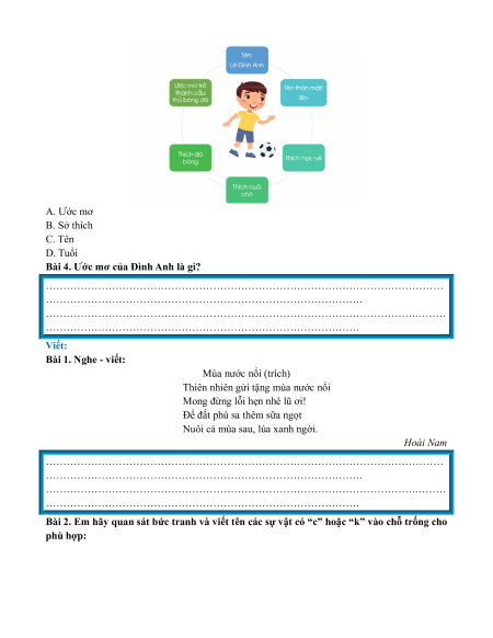 Bài 3. Bạn Đình Anh đã không giới thiệu điều gì về bản thân? A. Ước mơ B. Sở thích C. Tên D. Tuổi
