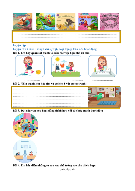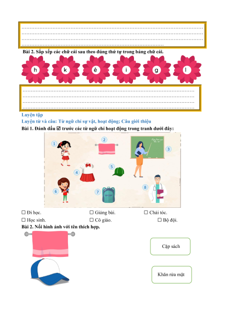 Bài 1. Đánh dấu ☑ trước các từ ngữ chỉ hoạt động trong tranh dưới đây: ☐ Đi học. ☐ Giảng bài. ☐ Chải tóc. ☐ Học sinh. ☐ Cô giáo. ☐ Bộ đội.