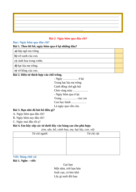 (em, sân, bố, cảnh hoa, mẹ, hạt lúa, con, vở) Từ chỉ người Từ chỉ vật Viết: Bảng chữ cái Bài 1. Nghe – viết: Gọi bạn Một năm, trời hạn hán Suối cạn, cỏ héo khô Lấy gì nuôi đôi bạn Chờ mưa đến bao giờ?