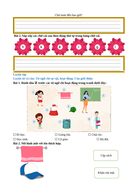 Bài 1. Đánh dấu ☑ trước các từ ngữ chỉ hoạt động trong tranh dưới đây: ☐ Đi học. ☐ Giảng bài. ☐ Chải tóc. ☐ Học sinh. ☐ Cô giáo. ☐ Bộ đội.