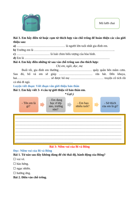 Bài 3. Em hãy điền từ hoặc cụm từ thích hợp vào chỗ trống để hoàn thiện các câu giới thiệu sau: