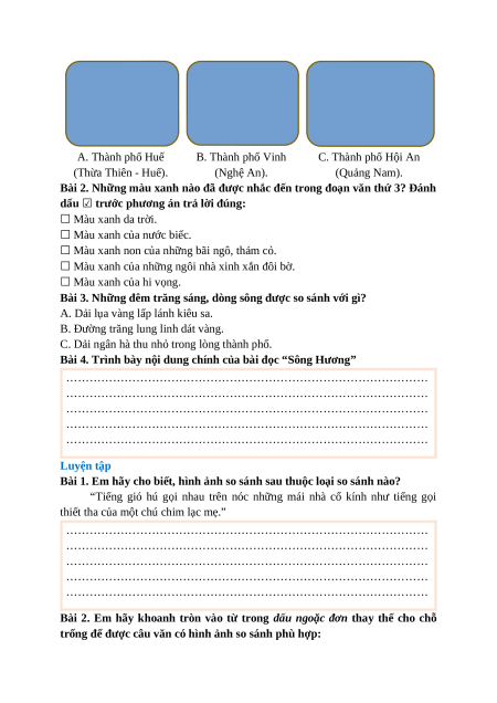 Bài 1. Sông Hương nằm ở đâu? A. Thành phố Huế B. Thành phố Vinh C. Thành phố Hội An (Thừa Thiên - Huế). (Nghệ An). (Quảng Nam).
