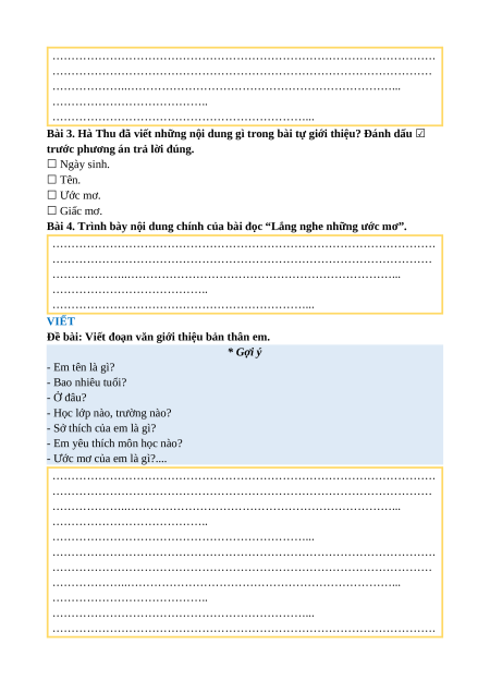 Bài 3. Hà Thu đã viết những nội dung gì trong bài tự giới thiệu? Đánh dấu ☑