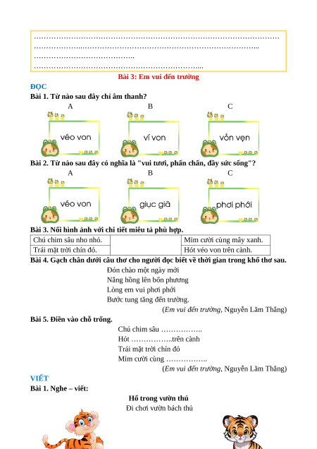 (Em vui đến trường, Nguyễn Lãm Thắng) VIẾT Bài 1. Nghe – viết: Hổ trong vườn thú Đi chơi vườn bách thủ