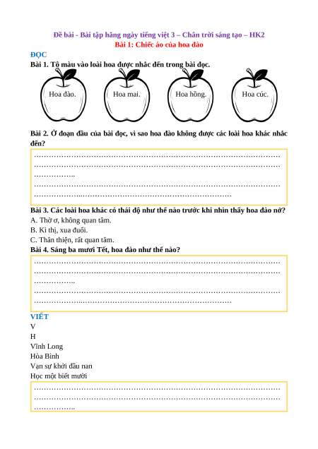 Đề bài - Bài tập hằng ngày tiếng việt 3 – Chân trời sáng tạo – HK2