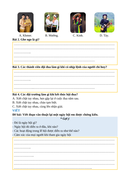 Bài 1. Hội đua ghe ngo của người: A. Khmer. B. Mường. C. Kinh. D. Tày.