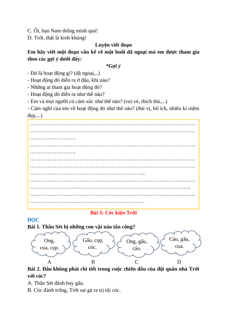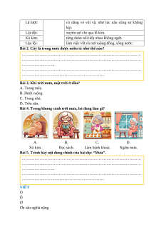 Bài 3. Khi trời mưa, mặt trời ở đâu? A. Trong mây. B. Dưới ruộng. C. Trong nhà. D. Trên sân.