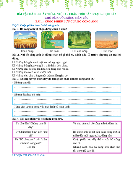BÀI TẬP HẰNG NGÀY TIẾNG VIỆT 4 – CHÂN TRỜI SÁNG TẠO – HỌC KÌ 2