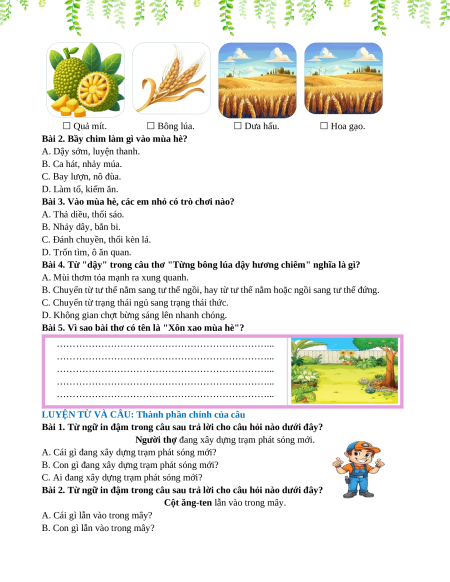 Bài 1. Sự vật nào sau đây không được tác giả miêu tả khi mùa hè đến?