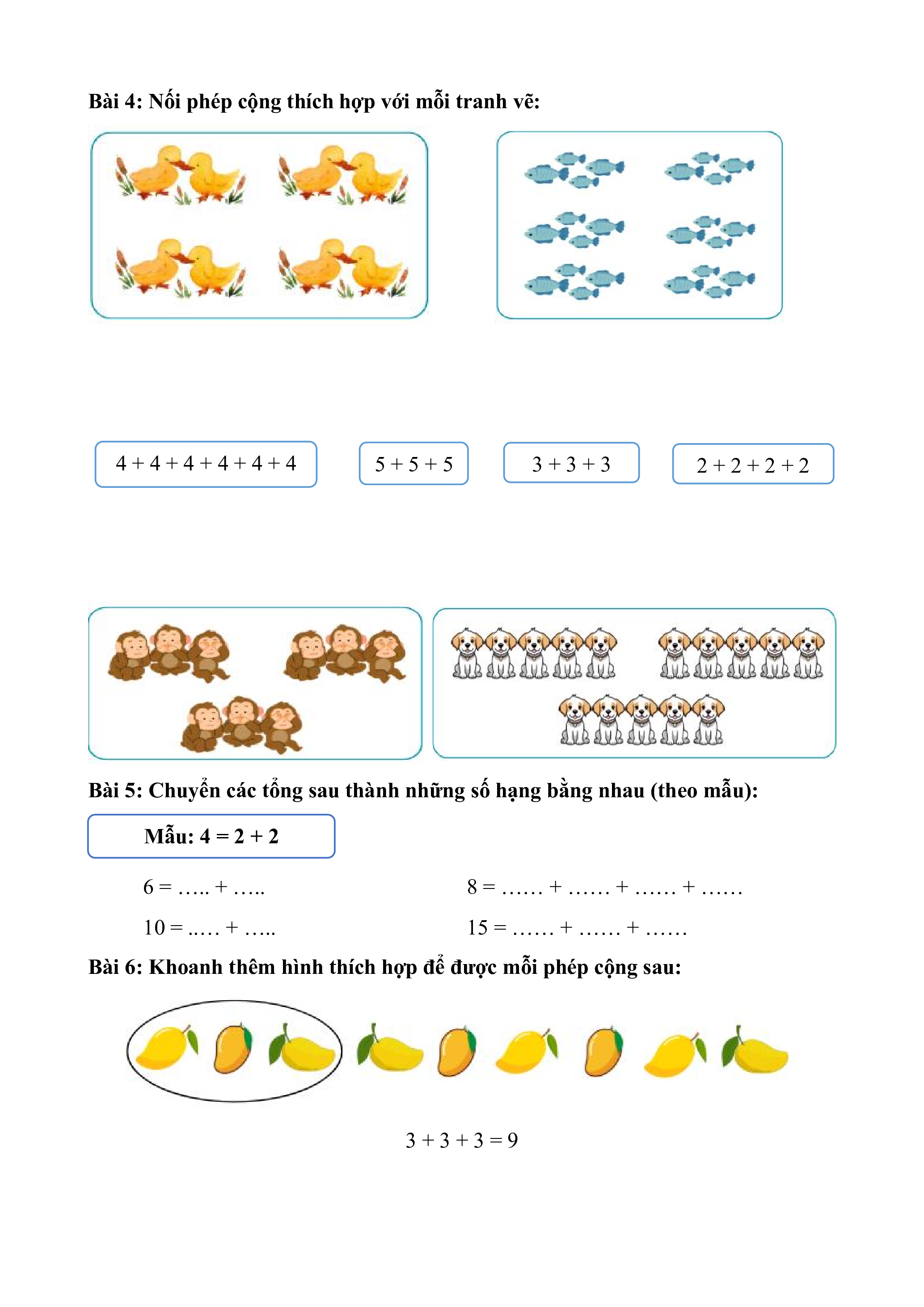 Bài 5: Chuyển các tổng sau thành những số hạng bằng nhau (theo mẫu): Mẫu: 4 = 2 + 2 6 = …. + ….
