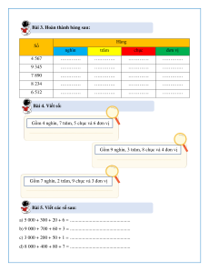 Bài 3. Hoàn thành bảng sau: Hàng Số nghìn trăm chục đơn vị 4 567 …………. …………. …………. …………. 9 345 …………. …………. …………. …………. 7 890 …………. …………. …………. …………. 8 234 …………. …………. …………. …………. 6 512 …………. …………. …………. …………. Bài 4. Viết số: