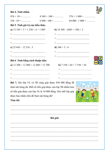 Bài 7. Hai lớp 5A và 5B cùng góp được 450 000 đồng để