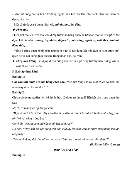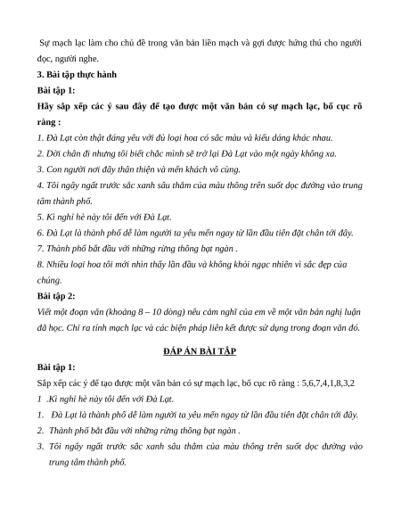đã học. Chỉ ra tính mạch lạc và các biện pháp liên kết được sử dụng trong đoạn văn đó. ĐÁP ÁN BÀI TẬP Bài tập 1: