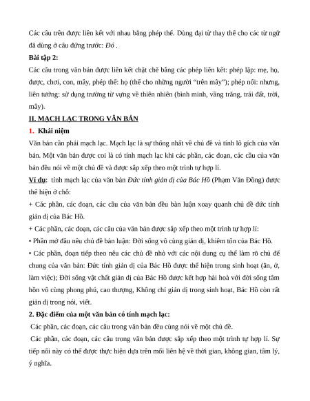 quan hệ về nội dung giữa các câu, các đoạn, các phần của văn bản bằng phương tiện ngôn ngữ thích hợp. Ví dụ: